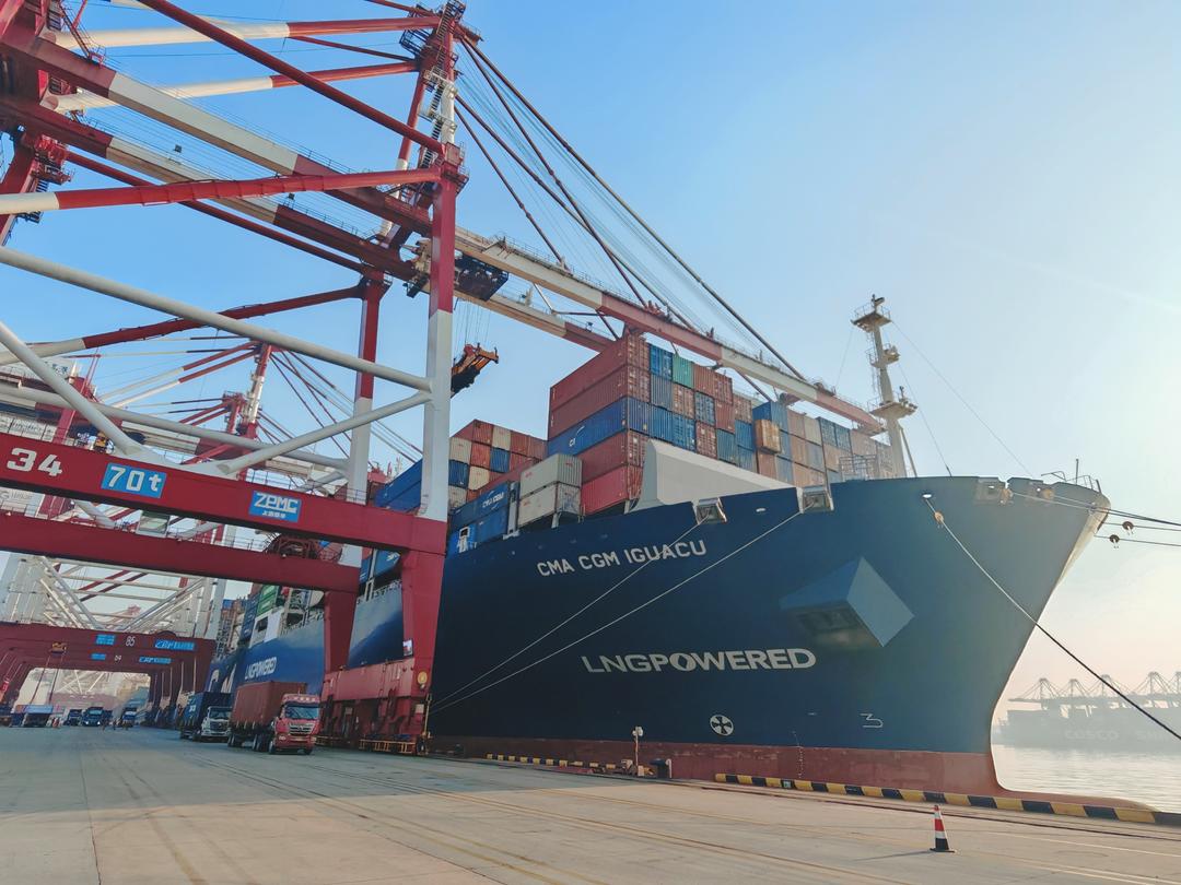 “‘达飞伊瓜苏’轮船长366米,载箱量1.5万标箱。本次在青岛港装卸10200标箱产品,主要包括新能源汽车、机械设备、电子产品、日用品、橡胶制品等。”山东港口青岛港前湾集装箱码头有限责任公司值班副经理张彦介绍,青岛港从泊位安排、堆场布局、岸桥密度、人员机械配置等方面提供保障,使得该轮完船时间比计划提前了2小时,获得了船方、货主的好评。