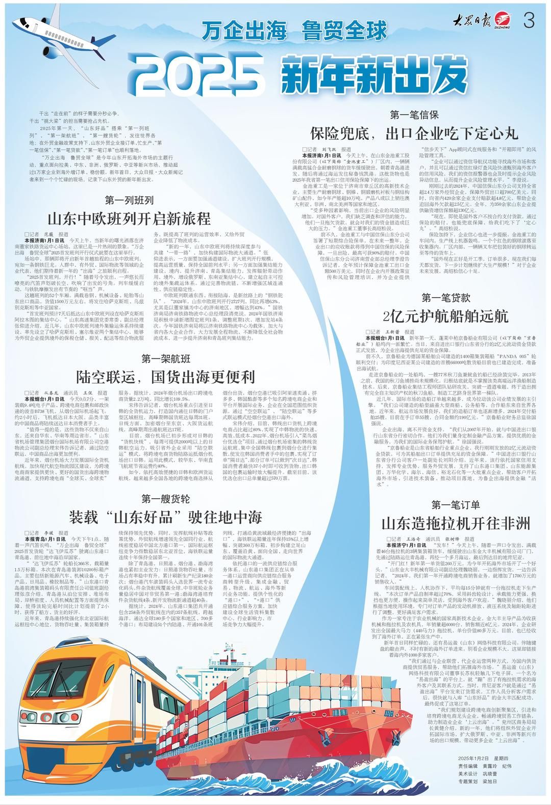 2025年第一天,“山东好品”搭乘“第一列班列”、“第一架航班”、“第一艘货轮”,发往世界各地;在外贸金融政策支持下,山东外贸企业接订单、忙生产,“第一笔信保”、“第一笔贷款”、“第一笔订单”也顺利落地。