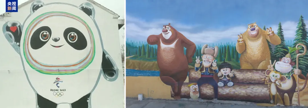 此前,村里一位奶奶对北京无比向往,但因身体原因无法动身,沈靖宇就将北京的代表性建筑画在了奶奶的院墙外,让奶奶在家门口就能看到北京。2022年,北京冬奥会期间,他手绘冰墩墩、雪容融为中国运动员加油。村里的孩子们爱看动画片《熊出没》,他就将其中的卡通形象搬到墙壁上。