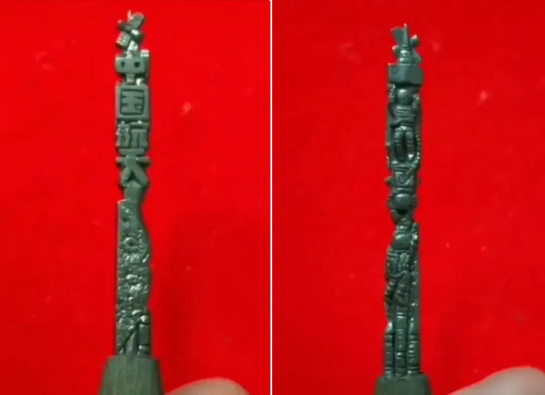 完成一件微雕作品少则几个小时,多则数天。令沈靖宇印象最深刻的是一个航天主题的微雕作品:一面是“中国航天”字样,另一面是三个身着太空服的航天员,细看上面还有国旗、火箭等元素,这些全被雕刻在了5毫米的铅笔芯上。