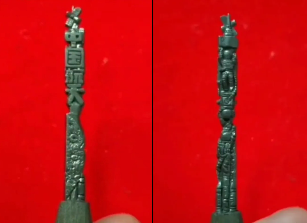 完成一件微雕作品少则几个小时,多则数天。令沈靖宇印象最深刻的是一个航天主题的微雕作品:一面是“中国航天”字样,另一面是三个身着太空服的航天员,细看上面还有国旗、火箭等元素,这些全被雕刻在了5毫米的铅笔芯上。