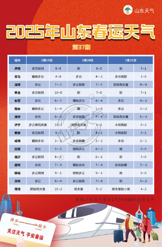 19日白天到夜间,聊城、菏泽和济宁天气多云转阴有雨夹雪,济南和泰安天气多云转阴局部有雨夹雪,其他地区天气多云。北部沿海地区北风转南风3~4级,其他地区北风2~3级。