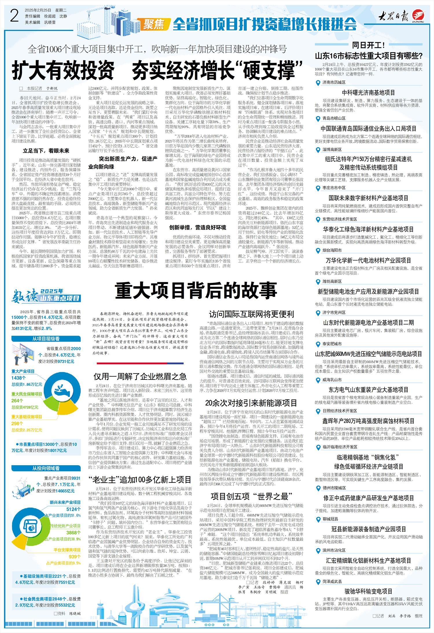 春潮澎湃处,扬帆奋进时,齐鲁大地掀起蛇年项目建设热潮。2月24日,全省抓项目扩投资稳增长推进会、2025年春季高质量发展重大项目建设现场推进会在济南举行,1006个重大项目在山东16市集中开工,吹响了山东全力拼经济、奋战“开门红”的冲锋号。这些重大项目“新”在哪?投资方有何考量?当地服务项目建设有哪些好做法好经验?记者选取5个标志性重大项目,讲述其背后的故事。