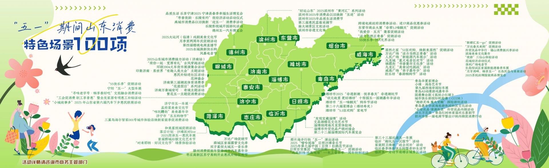 枣庄薛城区首届露营文化季融合露营市集、篝火音乐会、创意沙池、自然课堂、星空影院等元素,打造沉浸式露营体验;东营55快乐季-热AI无界活动,将城市记忆文化艺术展与东营市首届减脂大赛相融合,边逛边吃边减!潍坊的十笏园国潮嘉年华玩起了“古今混搭”,武术表演、模特走秀、文创市集,传统文化也能很潮酷;济宁孟府菜美食文化节,80余家济宁特色美食企业集体亮相,向消费者展示孟府菜的代表菜品以及餐饮企业的独特宴席设计;泰安“寻味老字号·畅享泰好吃”文旅融合消费活动,携手65家企业打造文旅融合消费场景;临沂的新琅琊街区直接开启“穿越模式”,汉服节上汉服巡游、非遗手作、古风美食一站式拿捏,分分钟让你变身“古代才子佳人”;德州的宁津春季幸福生活博览会简直是“吃货天堂”,特色美食、非遗手作、新能源汽车啥都有,逛一天都不带重样的!
