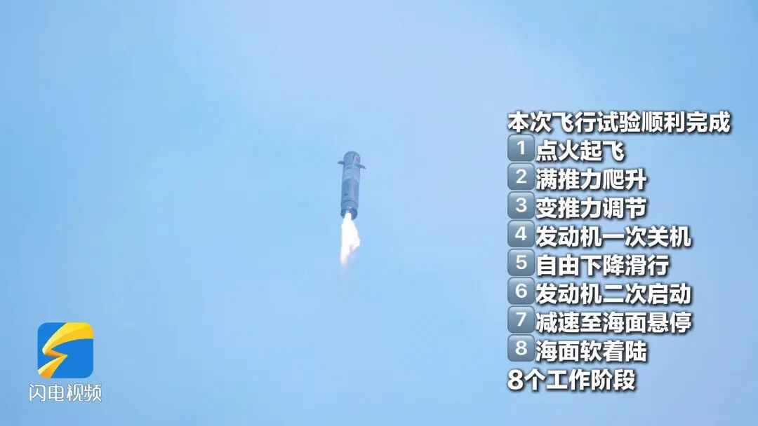 本次飞行试验顺利完成点火起飞、满推力爬升、变推力调节、发动机一次关机、自由下降滑行、发动机二次启动、减速至海面悬停、海面软着陆8个工作阶段。