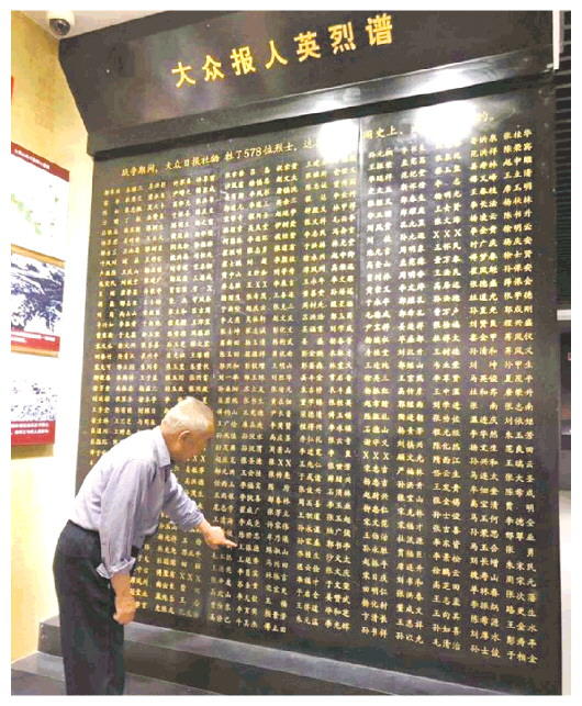 “大众报人英烈”纪念墙上,用金字镌刻着战争年代牺牲的578位烈士的英名。图为一位老人在纪念墙上寻找亲属的名字。(□资料图)