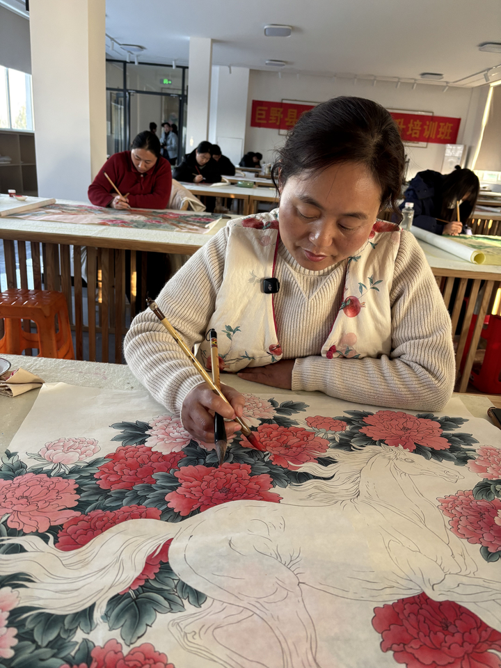 巨野工笔牡丹画知名度颇高,全国80%工笔牡丹画出自当地,各画院画风迥异,涵盖传统、新画法及中西结合风格,吸引各地客商选购,片区建设更是推动了产业整体发展。“工笔牡丹画看似简单,实则创作周期长,培育画师就像‘十月怀胎,一朝分娩’,需经长期基础培训,画好且形成自身风格更难,没法像企业那样快速盈利。”徐凤秋坦言,正是这份长期坚守,让书画院成为乡村振兴的重要力量——不仅让宝妈们摆脱“两点一线”的低落状态,实现“一手拿锄头,一手拿画笔”的幸福生活,部分学员学成后还带动周边宝妈创业,让“我妈是画家”成为孩子骄傲的宣言。