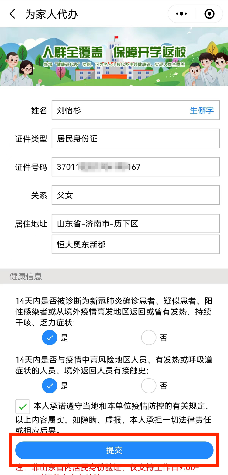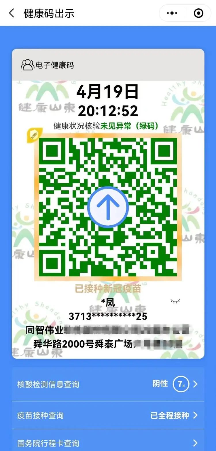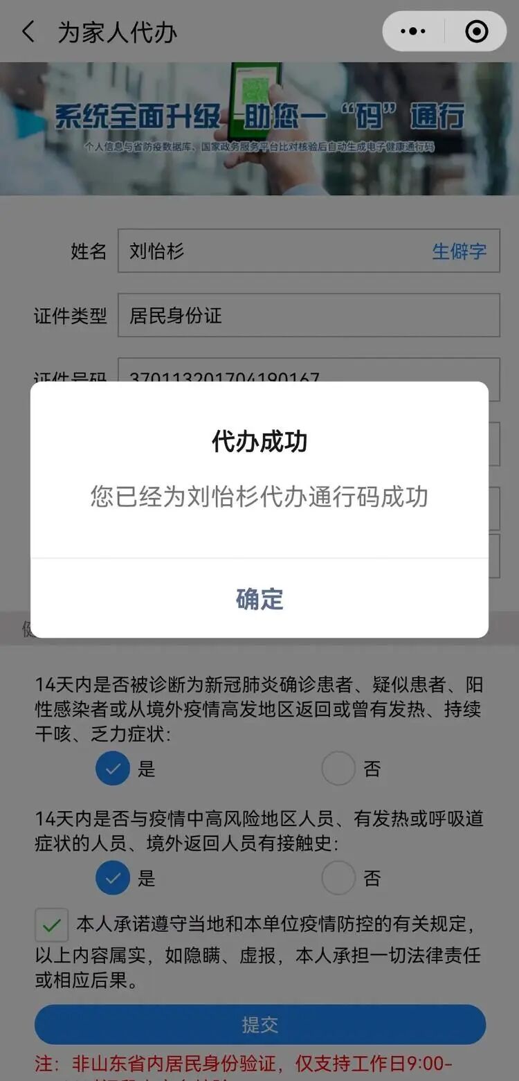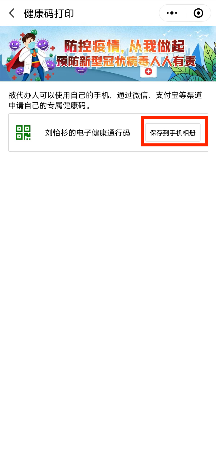 纸质电子健康码(爱心码)可以由家人通过山东健康码平台的“家人代办”模块代为申领,再通过“健康码打印”模块为其打印,然后随身携带使用,在出入场所时向场所管理人员出示即可: