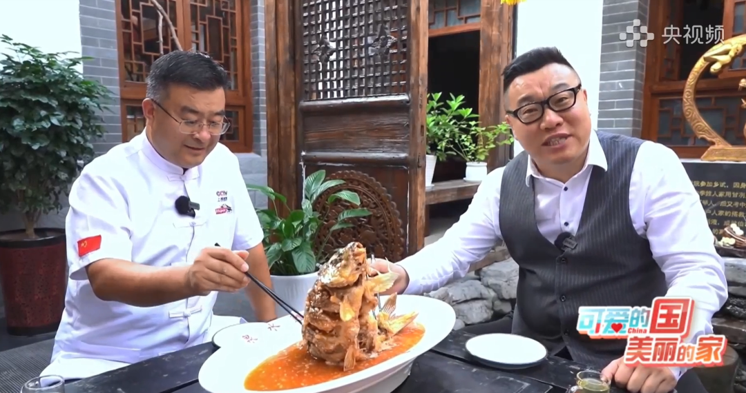 讲述完“糖醋鲤鱼”的来历,节目直播连线了山东广播电视台记者刘传佳(大壮),他带大家走进泉城济南曲水亭街找到老济南四合院饭店创始人李致庸,实地打卡舌尖上的京鲁名肴——糖醋鲤鱼。
