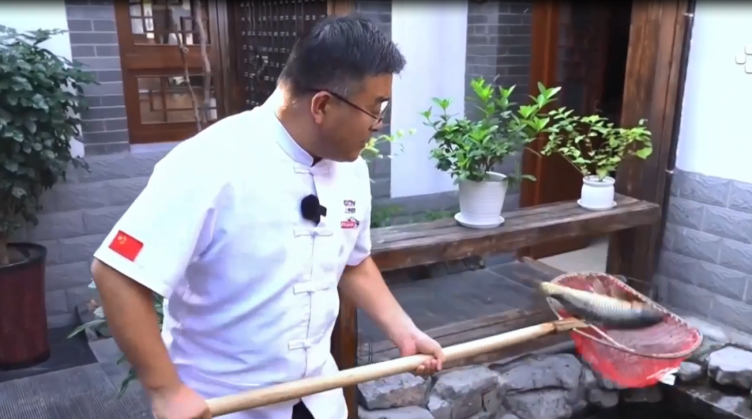 直播中,李致庸从四合院的“涌泉”中一网捞出了活蹦乱跳的黄河鲤鱼,走进厨房,改刀、油炸、浇汁......为大家现场烹饪糖醋鲤鱼。