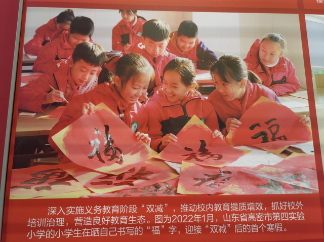 “今年1月11日,高密市第四实验小学开展‘写百福、迎寒假’活动,孩子们在书法老师的指导下,用毛笔写了百余个‘福’字,我用镜头记录了活动的精彩瞬间。”照片的拍摄者李海涛说,学校落实“双减”政策,利用课后服务时间组织各类学生社团,开展书法、剪纸、足球、地秧歌、地龙经拳等丰富多彩的活动。