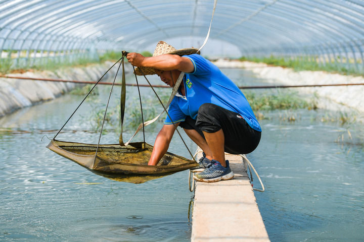 8月25日,在地处黄河岸边的内蒙古乌海市海南区巴音陶亥镇的盐碱水对虾养殖园区,工作人员在查看对虾生长情况。新华社记者 刘磊 摄