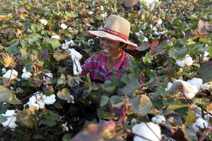 金秋时节,产棉大县山东省滨州市无棣县西小王镇6万亩盐碱地棉花进入采收季。9月28日,山东省滨州市无棣县西小王镇棉农在采收新棉。新华社记者 范长国 摄