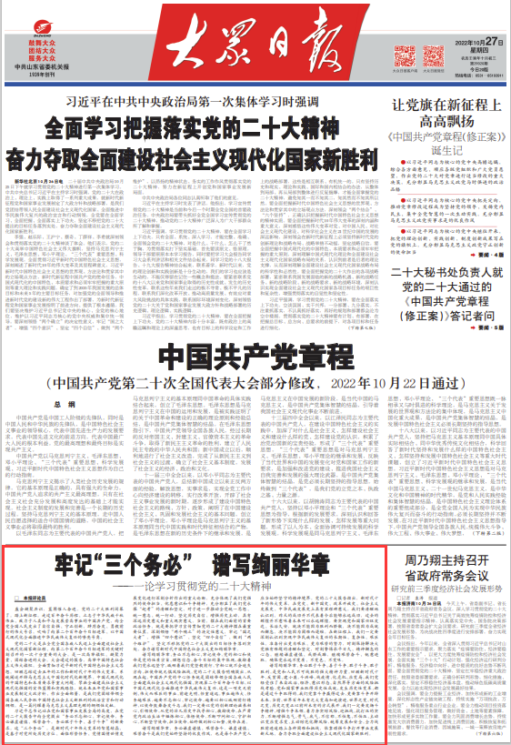 10月27日起,大众日报系统推出“学习贯彻党的二十大精神”系列评论,聚焦牢记“三个务必”、新时代十年伟大变革的里程碑意义、马克思主义中国化时代化、新时代新征程党的使命任务、高质量发展主题、以党的自我革命引领社会革命、团结奋斗开创新的历史伟业,对党的二十大报告作出深入阐释。赶紧收藏,一起学习吧!