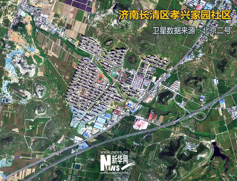 ▲济南长清区孝兴家园社区是山东省黄河滩区最大规模的迁建集中安置区,图为卫星视角下的济南长清区孝兴家园社区。