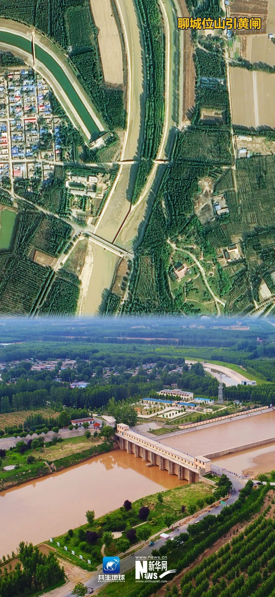 ▲聊城位山引黄闸卫星照片(上)和无人机照片。