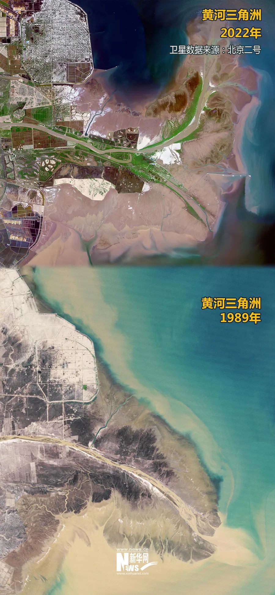 ▲卫星视角下的1989年和2022年黄河入海口对比图。黄河安澜,山东谱新篇:以立法强保障、以大投入固基础