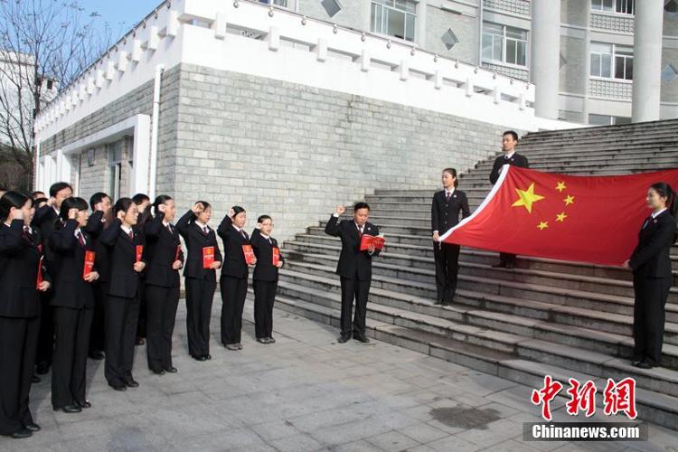 资料图:福建省武夷山市人民检察院全体检察官们手握《宪法》读本面向国旗向宪法宣誓。 王庆平 摄