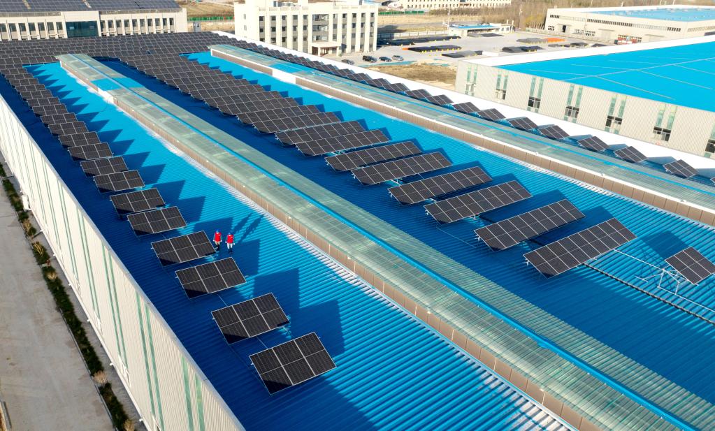 山东钟振伟旺新能源股份有限公司厂房屋顶上整齐排列的光伏电板(受访单位供图)