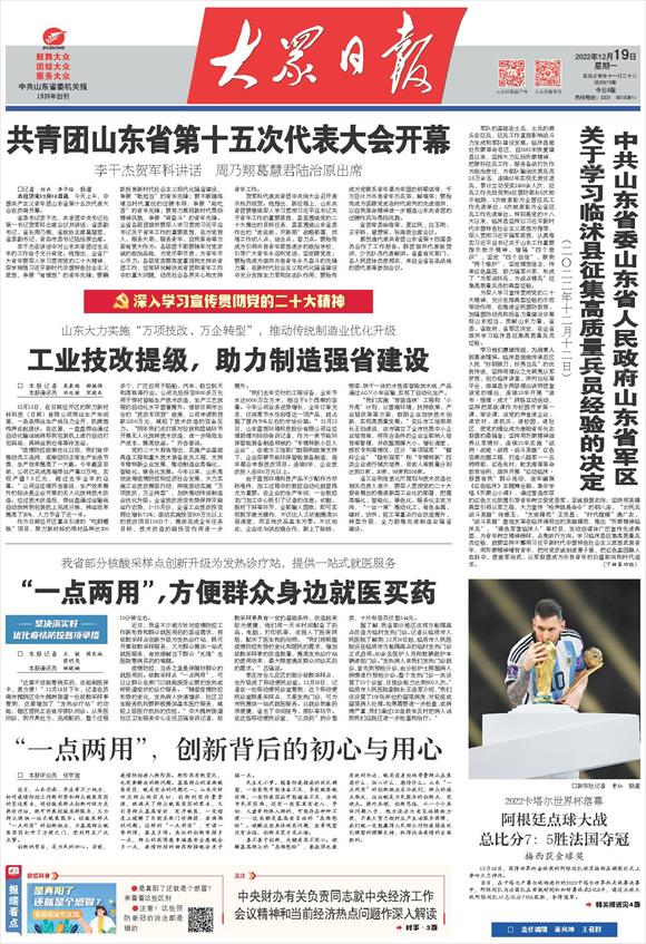 党的二十大报告指出,实施产业基础再造工程和重大技术装备攻关工程,支持专精特新企业发展,推动制造业高端化、智能化、绿色化发展。今年以来,山东高效统筹疫情防控和经济社会发展,大力实施工业技改提级行动,持续滚动实施“万项技改、万企转型”,加快推动传统制造业优化升级。全省技改投资形势保持平稳运行态势,1-10月份,全省工业技改投资同比增长7.3%;滚动实施投资500万元以上的技改项目11621个,提前完成全年任务目标,技术改造的稳投资作用进一步提升。