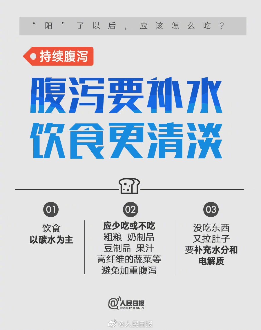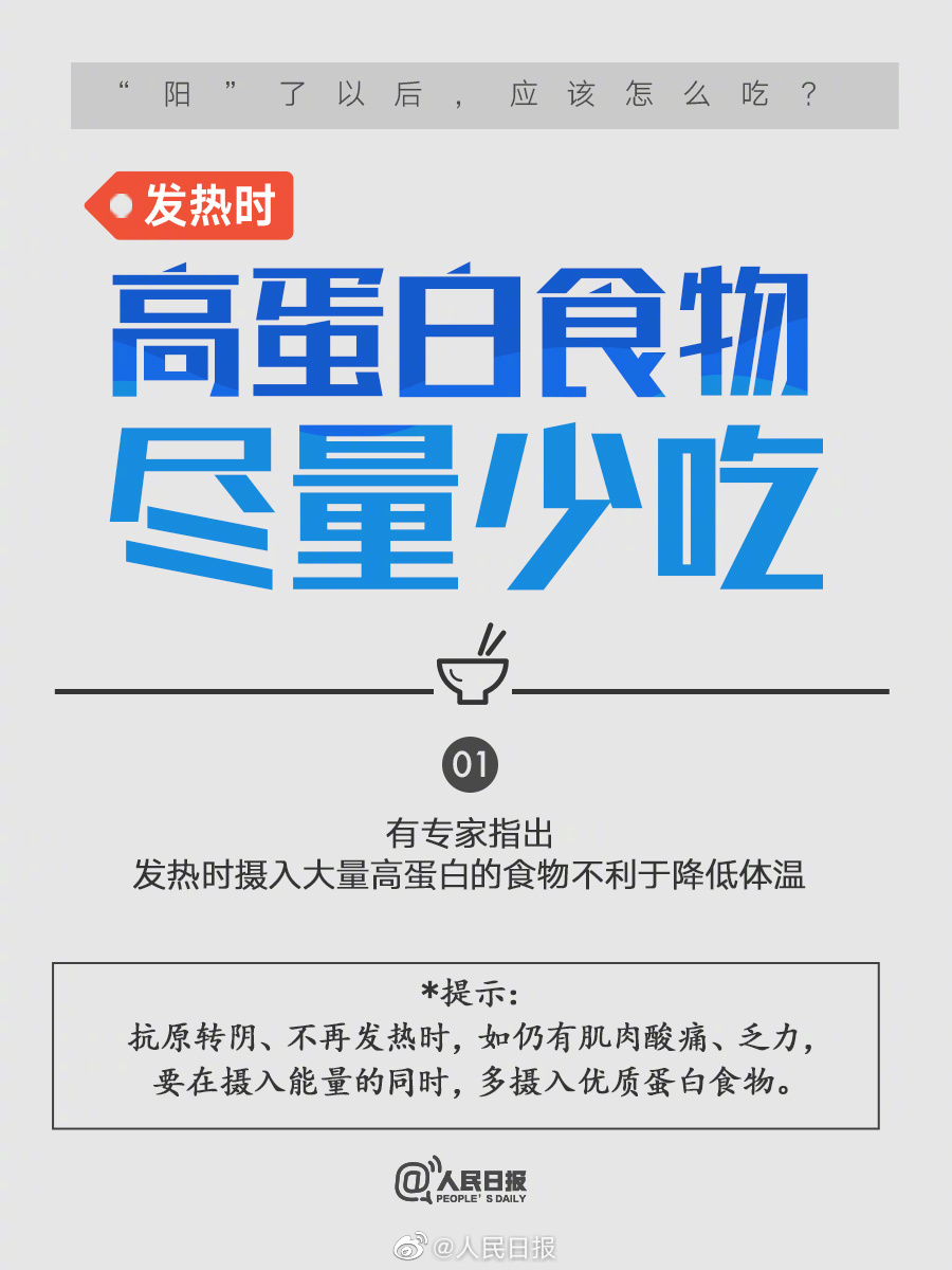 阳了以后该怎么吃?康复阶段饮食要点速览 2022-12-25 18:59 人民日报 0 阳了以后该怎么吃?9图速览康复阶段饮食要点:①发烧应喝足量水,小口喝水、慢慢喝水,但不要过量;②可摄入富含维C的果蔬;③咽痛没食欲可吃流食,建议面食为主;④老人胃口差时应注意清淡饮食、保证营养。温馨提示:根据症状变化,饮食要及时调整。