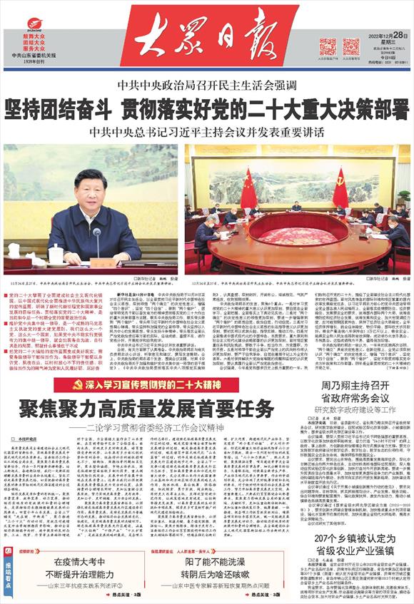 经济发展是质和量的有机统一。聚焦质量变革、效率变革、动力变革,推动经济实现质的有效提升和量的合理增长,是保持经济长期持续健康发展的必然要求。回望今年山东发展,全省上下锚定“走在前、开新局”,聚力推进“三个十大”行动计划,有效应对疫情反复冲击等超预期因素影响,推动全省经济保持稳中向好、进中提质的良好态势,工业、投资、外贸等主要指标增速好于全国,为全国稳大盘作出了山东贡献,在空前考验中交出了合格答卷。面向未来,实现更多更好新发展,培育塑强竞争新优势,山东具有多方面比较优势和有利条件,但亟待补齐的短板弱项也不少,结构性、周期性等问题相互交织,需求整体偏弱,市场主体承压,绿色低碳转型面临较多制约因素,重点领域风险仍然突出,发展中的矛盾集中体现在发展质量上。这要求我们必须把提高发展质量摆在更为突出的位置,在保持量的合理增长同时,更加注重综合发展质效,努力实现更高质量、更有效率、更加公平、更可持续、更为安全的发展。