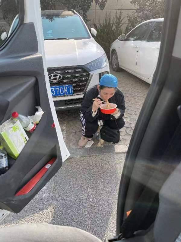 ▲青岛市第六人民医院院前急救车组成员出车间隙路边吃饭