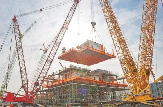 2月2日,位于青岛西海岸新区的海洋石油工程股份有限公司陆丰8-1DPP组块甲板片吊装现场,塔吊林立,热火朝天。