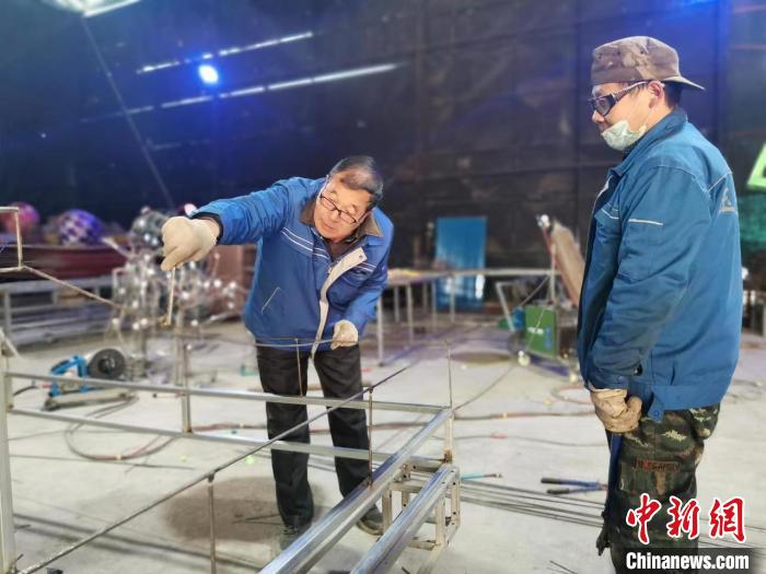 张向仁(左)指导工人制作大型花灯。 受访者供图