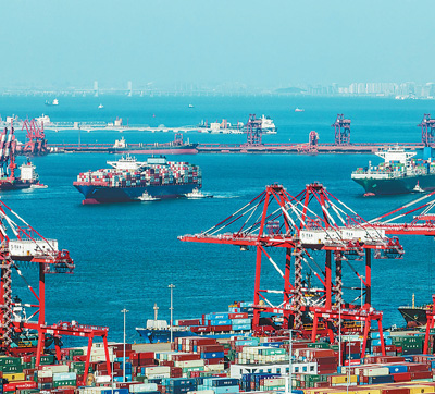 图为2月19日,集装箱船驶入山东港口青岛港前湾集装箱码头。