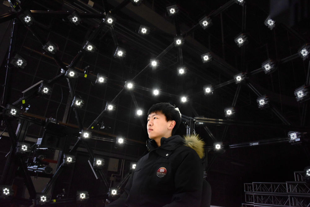 2月8日,青岛东方影都影视产业园一名工作人员在演示微表情捕捉技术。新华社记者 李紫恒 摄