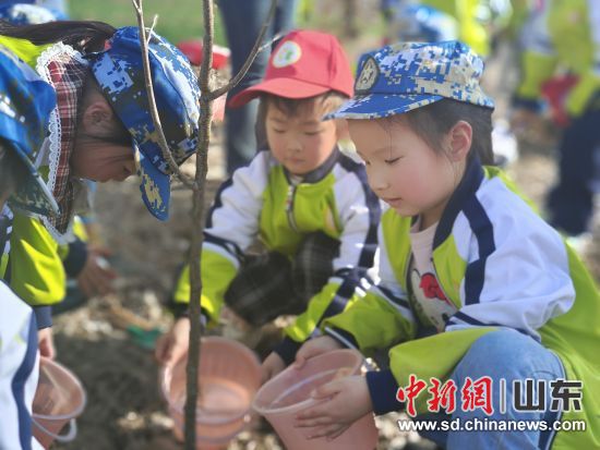 在泰安新泰市,幼儿园的小朋友们加入了植树的队伍。新泰市委宣传部供图