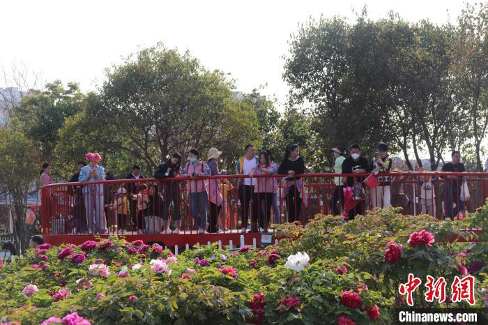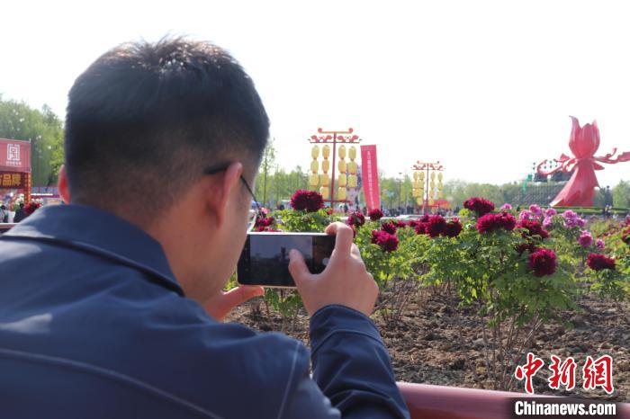 市民游客观赏牡丹,拍照留念。 李明芮 摄