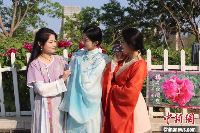 身着汉服的女子在牡丹花前聊天。 李明芮 摄