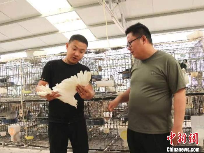 在山东省菏泽市牡丹区高庄镇大石庄村冬雨观赏鸽养殖孵化基地,负责人石东东给客户介绍观赏鸽。 郜玉华 摄