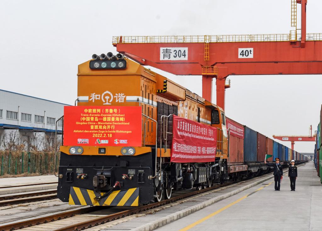 2022年2月18日,中欧班列(齐鲁号)中国青岛—德国曼海姆双向对开首班列车从上合示范区青岛多式联运中心出发。新华社发(王昭脉摄)