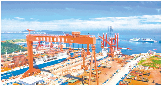 山东把海洋作为高质量发展的战略要地,大力发展现代海洋产业,把船舶和海工装备产业链作为11条标志性产业链之一进行重点突破。图为招商局金陵船舶(威海)有限公司。(□记者郑莉报道)