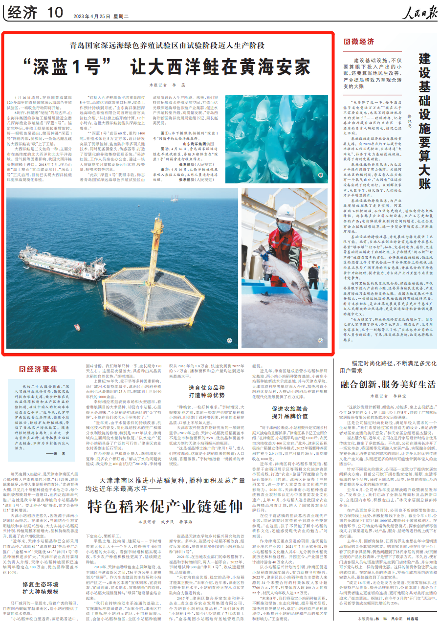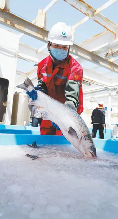 4月16日清晨,在我国黄海离岸120多海里的青岛国家深远海绿色养殖试验区,一场收鱼行动即将开始。8时许,伴随着“哒哒”的马达声,山东海洋集团的养殖工船缓缓驶近全潜式深海渔业养殖装备“深蓝1号”。锚定完毕后,养殖工船尾部起重臂旋转,将一根吸鱼泵递出,继而伸进“深蓝1号”网箱内部,刹那间,一条条活蹦乱跳的大西洋鲑被“吸”上了工船。大西洋鲑是三文鱼的一种,主要分布在高纬度的北大西洋和北太平洋海域。受气候等因素影响,我国大西洋鲑长期依赖于进口。2018年7月,作为山东“海上粮仓”重点建设项目,“深蓝1号”正式启用,目前已实现大西洋鲑低纬度深海规模化养殖。“这批大西洋鲑单鱼平均重量超过5千克,品质达到欧盟出口标准,收鱼工作预计持续到月底。”山东海洋集团深远海绿色养殖有限公司首席运营官吴济红介绍,“从打捞上船开始计算,12个小时内,这批大西洋鲑就能从深海走上餐桌。”“‘深蓝1号’直径60米,重约1400吨,养殖水体达5万立方米,设计研发突破了沉浮控制、鲨鱼防护等多项关键技术,同时配备摄像头、传感器等,打造了智慧化的养殖集控管理系统。”吴济红说,工作人员坐在办公室,通过一块大屏就能实时掌握设备运行状态、投喂量、投喂次数等信息。“此次‘深蓝1号’获得丰收,标志着青岛国家深远海绿色养殖试验区由试验阶段迈入生产阶段。未来,我们将持续拓展海水养殖发展空间,打造百亿元级深远海绿色养殖产业集群,促进水产养殖转型升级、高质量发展。”青岛西海岸新区海洋发展局党组书记、局长赵英民说。