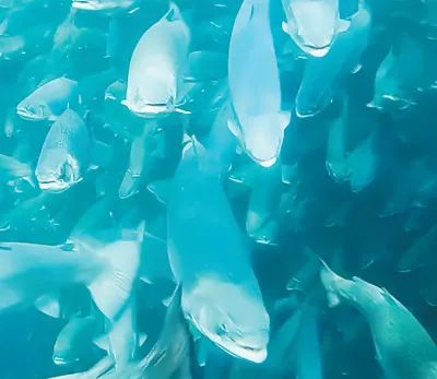 水下摄像机拍摄的“深蓝1号”网箱中的大西洋鲑鱼群。山东海洋集团供图