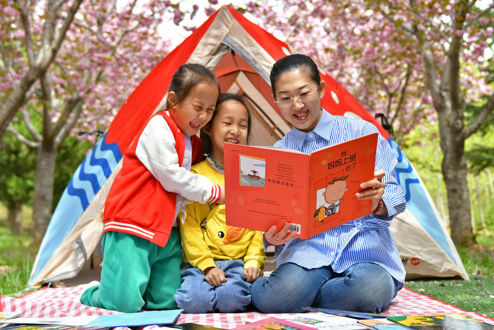 4月23日,在山东省烟台市福山区鲁东园艺场,第二实验幼儿园的小朋友和老师一起阅读绘本。新华社发(孙文潭 摄)