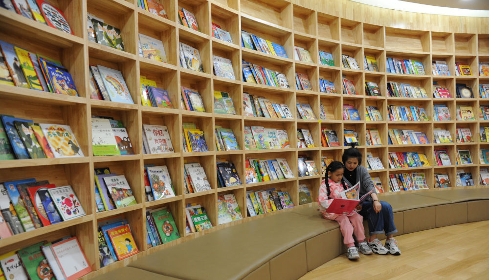 4月22日,在山东省邹城市新华书店孟子书城,一对母女在阅读图书。新华社发(王愿生 摄)