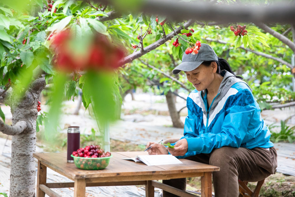4月23日,山东省淄博市高青县芦湖街道大芦家村农民卢小云在樱桃园读书学习。新华社发(张维堂 摄)