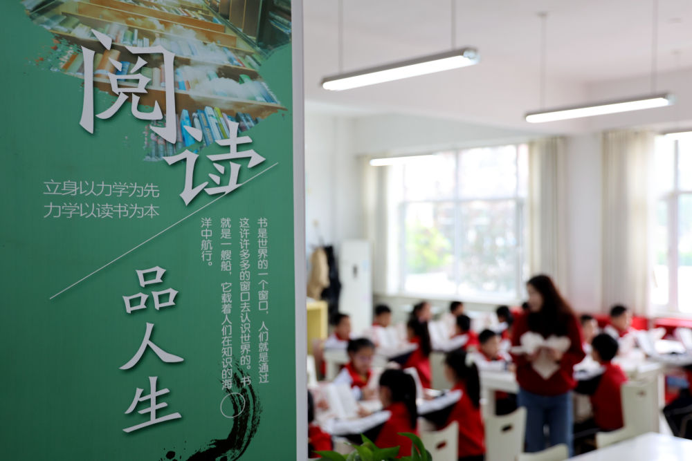 4月23日,山东省滨州市渤海中学南校区的小学生们在老师的带领下阅读书籍。新华社发 (初宝瑞 摄)
