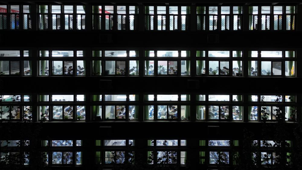 4月23日,山东省滕州市至善学校的学生在教室内晚自习(无人机照片)。新华社发(李志军 摄)