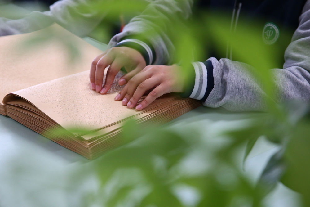 4月23日,在山东省济南特殊教育中心阅览室,视障学生在上阅读课。新华社发(郝鑫城 摄)