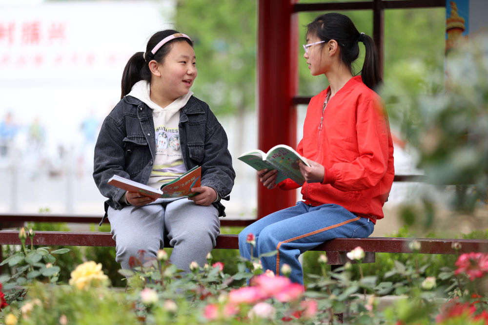 4月23日,两名小女孩在山东省临沂市郯城县郯城街道东南村文化长廊分享读书心得。新华社发(张春雷 摄)