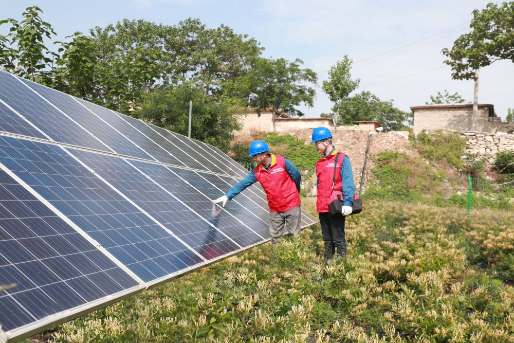 国网济南市平阴县供电公司员工在北毛峪村巡视检查光伏设备运行情况。(新华社记者王志 摄)