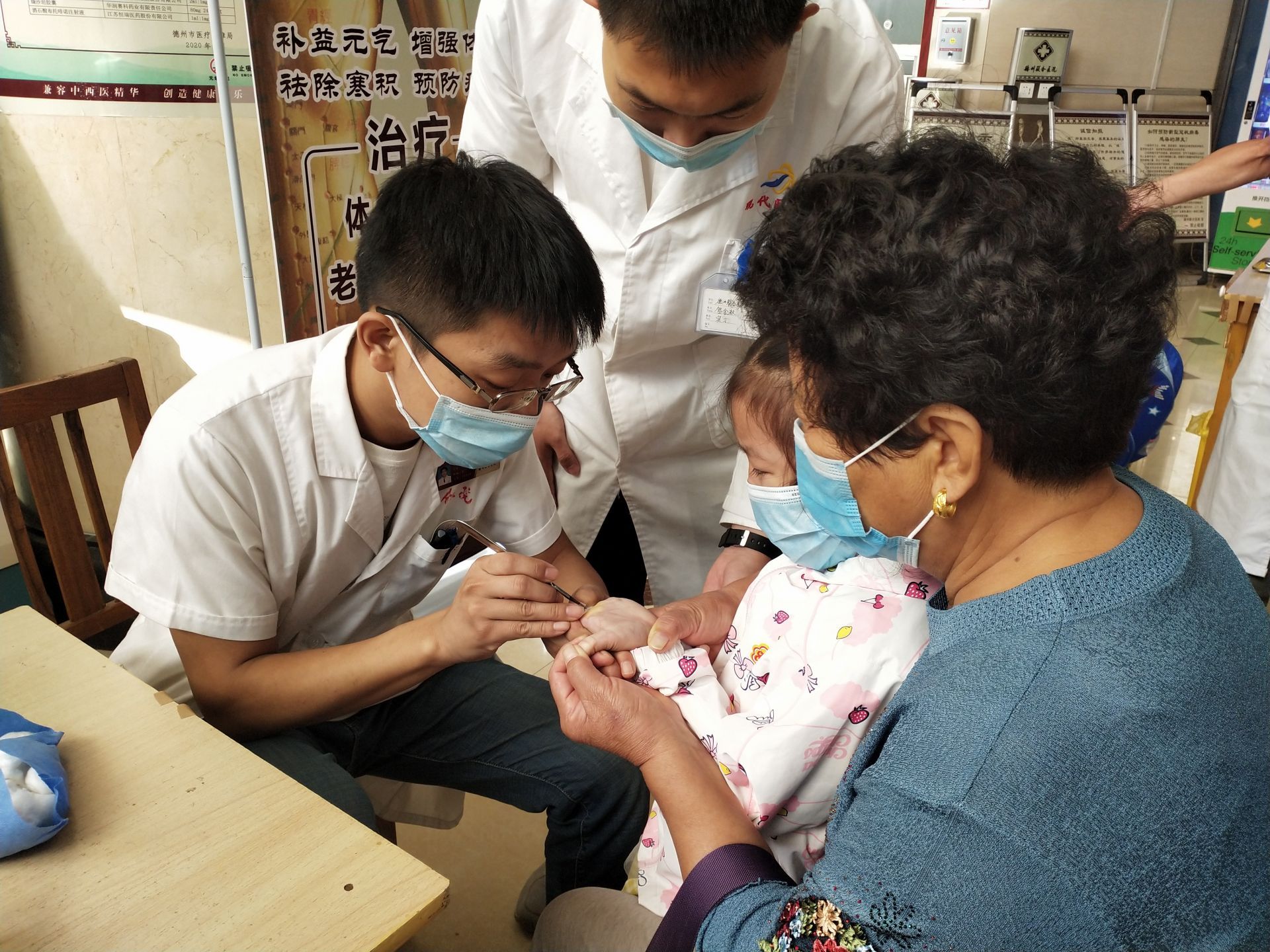 只见贺玉英在男孩掌内食指、中指根部消毒,并快速割了一个小口,在皮下取出了一定数量的脂肪小体,贴敷创伤部位并按压,治疗就结束了,整个过程仅用了2分钟。孩子还未觉到痛感,割积过程已然结束。
