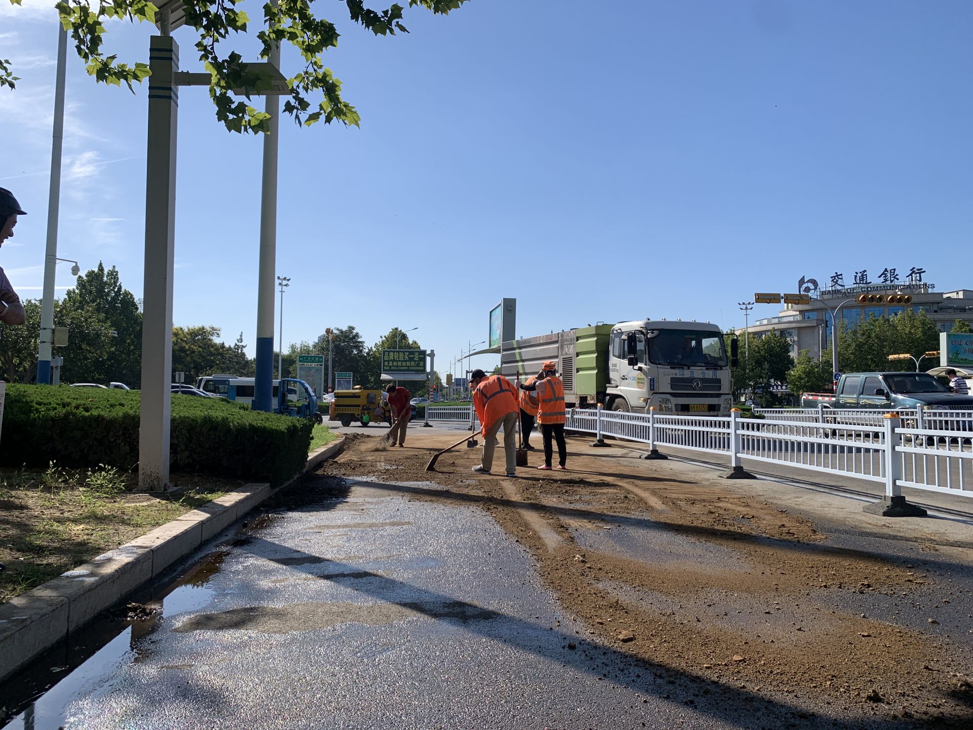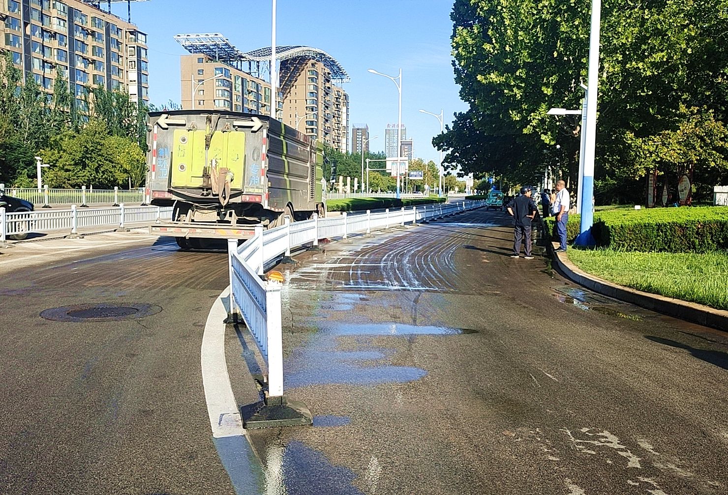 为防止车辆因路面油污打滑,保洁作业人员在事故路段设置安全警示标志,提醒过路车辆注意安全。接着将油污路面全部覆土,待油污被吸附之后,利用扫帚、铁锨、袋装收集车等将脏污的土打堆收集运走。接着出动洒水车将路面打湿,保洁员用扫帚清扫路面残余油渍,之后出动高压冲洗车反复冲刷路面,最后安排机扫车收尾,将路面积水、污物彻底清扫干净。经过近2个小时,利用人工+机械结合清理方式,路面恢复原貌。