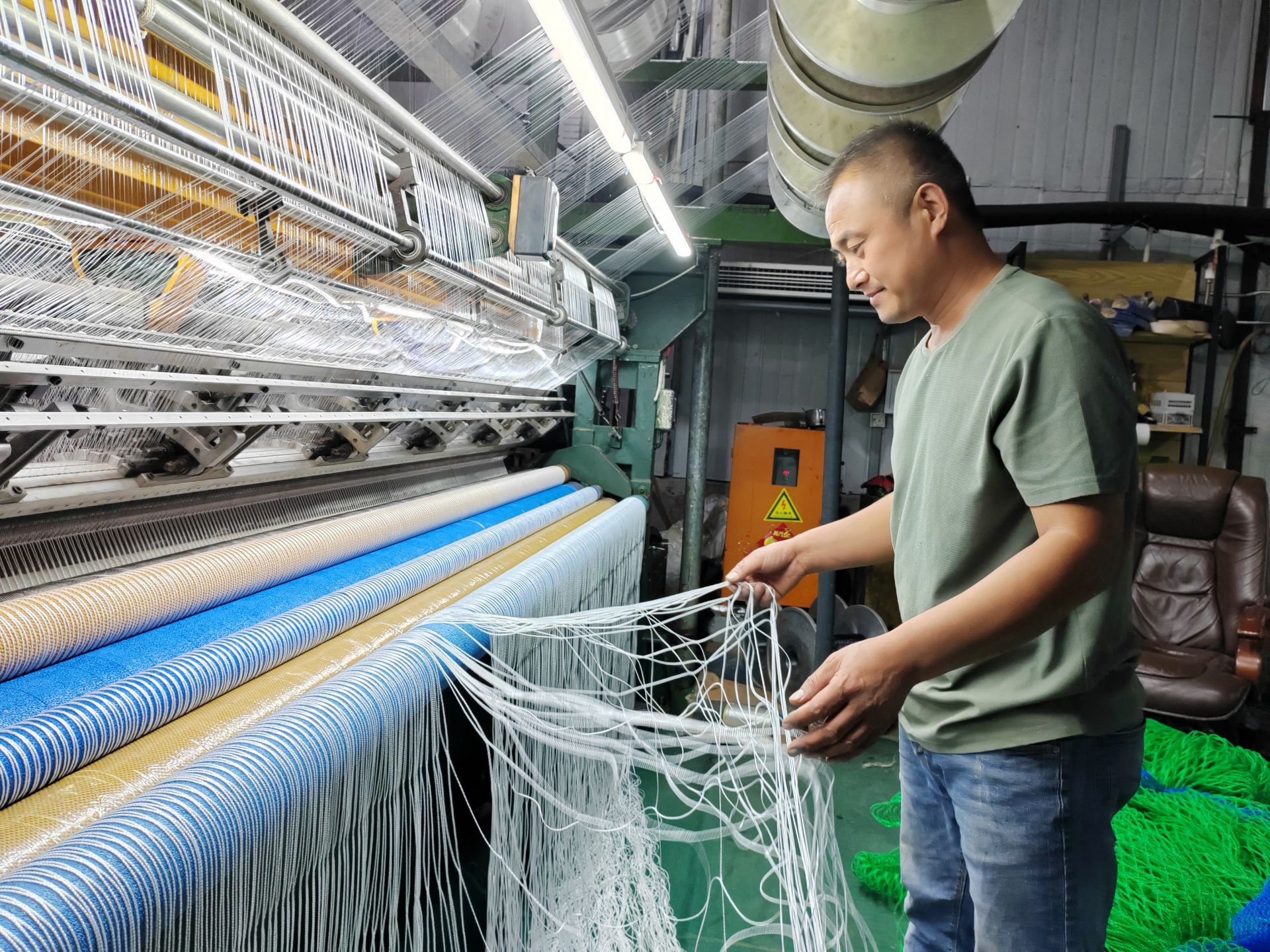 起初,厂里的员工只有三四人,后来随着订单量的增长,他扩大生产规模,购置了6台大型编织机,产品种类也由之前的篮球网、足球网等普通球网进一步扩展到高尔夫球场围网、动物园场地围网、深海网箱等多样化产品。凭借着丰富的经验和良好的信用,厂子越做越大,不仅与国内多家企业建立了长期合作关系,通过外贸出口产品甚至远销欧美国家。目前,体育器材厂年均产值近1000万元。
